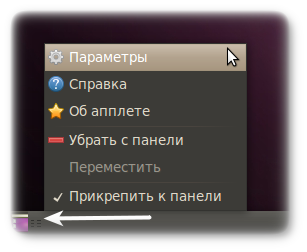 На рисунке выше вы видите в самом левом углу апплет, который сворачивает все окна и показывает рабочий стол. А как же вызывать настройки для апплета, который нам нужен? Если вы приглядитесь, вы увидите двойную линию справа. Это и есть то, что нам надо. Нажмите правой кнопкой мыши и выберите параметры.