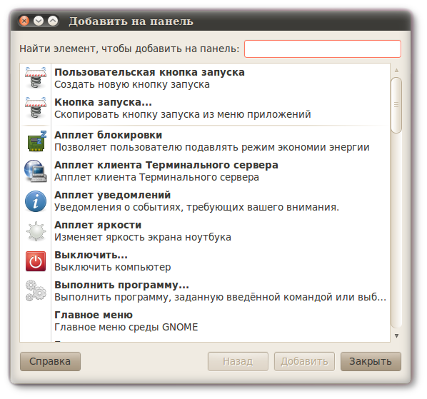 Вы видите перед собой все апплеты, которые можно добавить на панель.