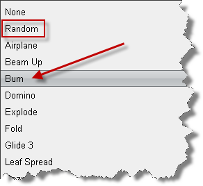 Как я уже говорил ранее, можно выбрать произвольный эффект. В этом случае каждый раз будет выбран один из эффектов, которые вы выберите (я уже показывал выше, где выбирается список таких эффектов. Для этого нужно выбирать опцию "Random". Но мы выберем эффект "Горение" (Burn).