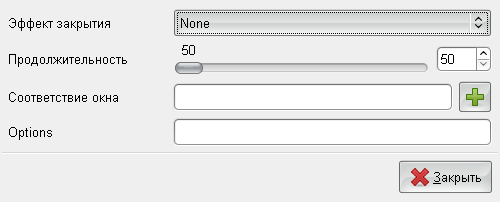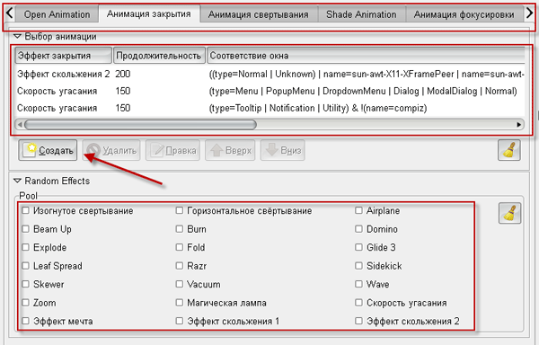 Условно разделим экран настроек на три части. В самой верхней части вы выбираете то событие для которого будет производится настройка. Например, закрытие или открытие окна. Чуть ниже идут правила, которые описывают для каких типов окон какие эффекты будут применены. Применяется только один эффект. Но почему их в списке три? Они для разных типов окон. Т.е. сначала просматривается первое правило. Если совпадает - вызывается эффект, если нет - просматривается следующее правило, и т.д. И в самом низу идет список эффектов, которые будут применены, если вы выберите случайный эффект. В списке эффектов обратите внимание на поле "Соответствие окна". Для тех, кто немного знает английский должно быть понятно (исходя из значения type=), что: первый эффект используется для обычных окон, второй для меню и диалогов, третий - для всплывающих подсказок... Т.е. если вы хотите изменить поведение для обычных окон - измените эффект для первой строки в этой таблице. Сейчас мы создадим специфический эффект, который будет применяться только для терминала. В качестве события я выбрал закрытие окна. Нажимаем на кнопку "Создать".