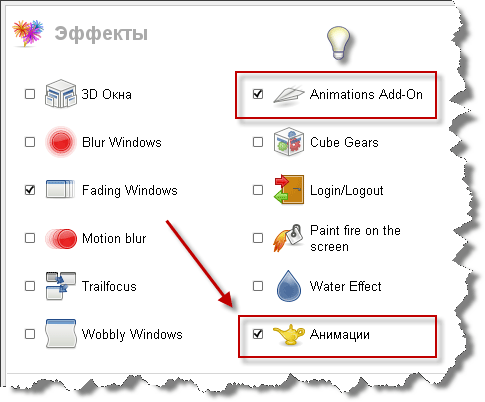 В менеджере настроек Compiz Fusion находим категорию "Эффекты". Проверьте чтобы был включен плагин "Анимации". Начиная с версии 8.10 необходимо включить плагин "Animations Add-On", если вы хотите чтобы были доступны все анимации, включая и эффект горения! Итак, заходим в настройки плагина "Анимации".