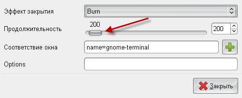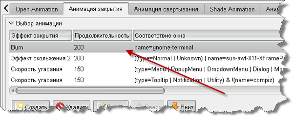 Мы задали условие. В принципе его можно написать руками. Условие простое - "Если имя окна равно gnome-terminal". Не путайте с именем заголовка окна, т.к. оно может меняться. Жмем кнопку добавить. Выставьте продолжительность около 200. Впоследствии для каждого эффекта вы подберете нужную скорость.