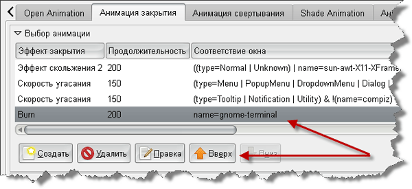 Но если вы попробуете открыть и закрыть терминал прямо сейчас - ничего не получится. Почему? Как я уже говорил выше, эффекты просматриваются по-порядку, сверху вниз. И если находится совпадение - то срабатывает нужный эффект и дальнейший просмотр останавливается. А терминал попадает под первое правило: все обычные окна. Поэтому выделяем наш новый эффект и двигаем его в самый верх списка.
