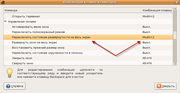 Следующая комбинация клавиш, которой я пользуюсь - Win + Z, для того чтобы максимизировать окно / вернуть к первоначальному размеру. В Windows я использую специальную программу, чтобы сделать это, а тут это делается обычной настройкой. Красота! Ну и последние настройки, это те, которые используются в Windows по-умолчанию. Я имею в виду такие клавиши как Win+D, с помощью которых можно свернуть все окна и показать рабочий стол. Также можно поменять комбинацию для вызова диалога запуска программ (Win+R вместо Alt+F2), поиска (Win+F) и всего чего угодно, что вы найдете и чем вы пользовались в Windows. Если вообще пользовались конечно.