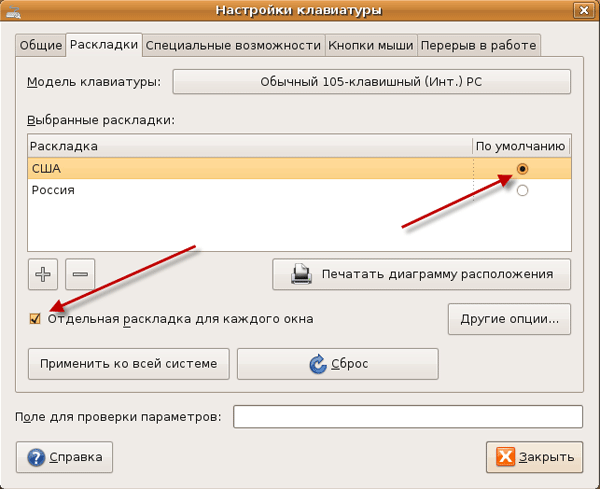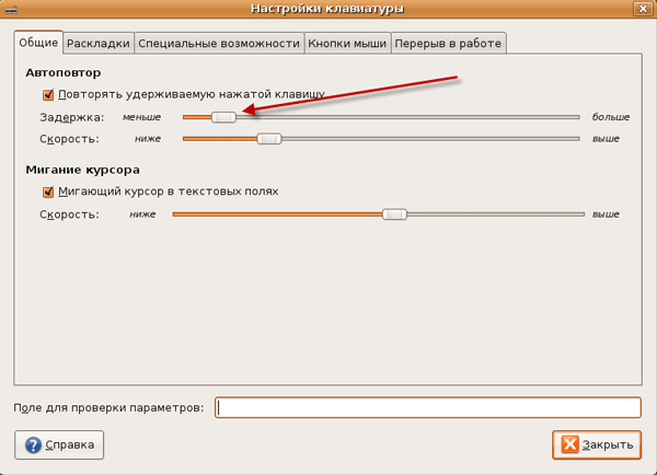 Я привык к тому, что задержка между повтором символа очень маленькая и поэтому сразу же передвигаю ползунок левее. В поле ниже можно проверить скорость повтора символов. Если вас устраивает текущая скорость - переключайтесь дальше на вкладку "Раскладки".