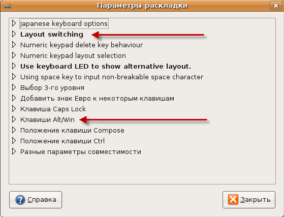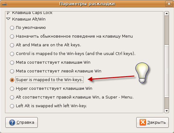 Выбирайте то, к чему вы привыкли. Обратите внимание на то, что можно выбрать сразу несколько способов переключения. Это удобно если за компьютером работают два человека, используют один аккаунт, и привыкли к разным раскладкам. Следующий пункт будет важным для некоторых людей: "Клавиши Alt/Win". Чуть позже мы будем настраивать горячие клавиши для различных событий. И если вы хотите чтобы клавиша Win могла быть использована в сочетаниях клавиш (например можно настроить Win + D для сворачивания окон, как это сделано в Windows), то обязательно выставьте опцию как на рисунке ниже.