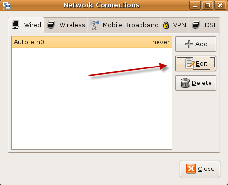 У вас уже должно быть создано проводное соединение с автоматической настройкой, поэтому выделяем его и нажимаем "Edit". (Если соединение не было создано автоматически - выбирайте пункт Add).