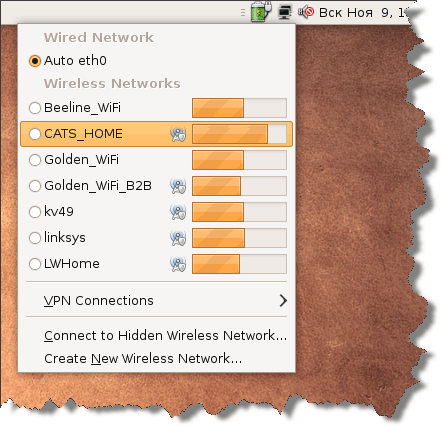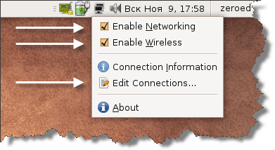Перед тем как мы продолжим далее, нам нужно настроить сеть и интернет. К сожалению, тема эта настолько обширная, что описать все возможные ситуации просто невозможно. Причиной неработоспособности сети может быть что угодно - начиная от драйвера устройства и заканчивая каким-нибудь параметром, который вы упустили (например частота wifi сети при ручной настройке или что-нибудь в этом роде) Gnome Network Manager (GNM)По умолчанию у вас установлен Gnome Network Manager, который находится в трее (справа на верхней панели). Значок восклицательного знака говорит о том что сеть у нас не работает. Я специально вытянул провод. ![]() Вернем провод на место... GNM пытается соединиться. ![]() Ну вот и все, сеть на месте, все прекрасно работает. ![]() К сожалению, не у всех есть DHCP сервер, который сам обо всем позаботится... Нажмем правой кнопкой мыши. ![]() Из рисунка видно, что у меня два вида сети: обычная (проводная) и беспроводная (wifi). Если вы не пользуетесь WiFi, то его можно отключить. Но если отключить галочку "Enable Networking", то отключится вся сеть полностью, а не только проводная. На рисунке есть пункт меню "Edit Connections", с помощью него можно настроить сеть вручную. Чуть позже будет показано, как это сделать. Теперь нажмем левой кнопкой мыши.
