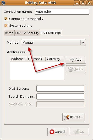 Выберите закладку "IPv4 Settins". Вы можете видеть, что по-умолчанию стоят автоматические настройки (DHCP). Выберите из списка ручные настройки "Manual" и нажмите кнопку "Add".