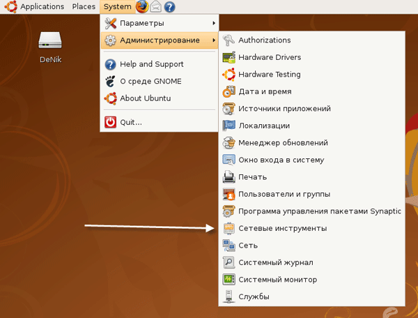 После того, как вы их установите - перегрузите компьютер и кнопка должна стать активной. Диагностика сетиЧтобы проверить работоспособность сети, если вы более менее разбираетесь в этом, можно использовать консоль либо графическое приложение, которое предоставляет много инструментов. ![]() Выбираем System (Система) - Администрирование - Сетевые инструменты. Не путайте с пунктом меню "Сеть"! ![]() По списку табов вверху можно понять какой функционал предоставляет программа. Если вы не знаете что означает тот или иной функционал - ... читайте документацию. Не забудьте поменять Network Device на тот, который вы тестируете! В консоли можно сделать то же самое. Например, чтобы пропинговать сервер, выполните такую команду: ping 192.168.0.1 Чтобы остановить программу - нажмите ctrl+c. Вместо 192.168.0.1 поставьте ip-адрес вашего сервера. Чтобы протестировать подключение к интернету, сделайте, например, так: ping www.google.com Если пинг не проходит - попробуйте пинговать напрямую по ip: ping 74.125.39.147 Если пинг по-прежнему не идет - выход в интернет не настроен. Если пинг проходит - интернет уже есть, но не настроены DNS-сервера. И т.д. и т.п.... Можно до бесконечности писать то, что можно попробовать.