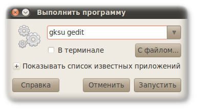 Здесь можно запускать любую команду. Допустим, мы хотим запустить редактор файлов gedit (рассмотрен в следующей статье) с правами суперпользователя. Для этого используйте команду: gksu gedit ... где gksu это аналог sudo, но пароль будет запрошен через диалог, а не через консоль.