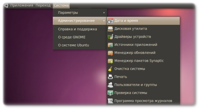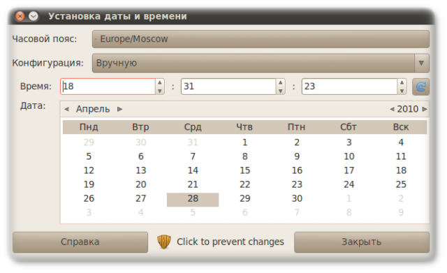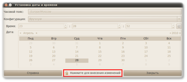 Если вы напишите команду "sudo gedit" и нажмете Run, то вы ничего не увидите, т.к. консоли, собственно говоря и нету. Если вам нужно запустить графическую программу, например редактор, с правами суперпользователя - используйте команду gksu команда в диалоге запуска программ (Alt+F2) Частичная блокировкаРассмотрим еще один пример, где необходимы права суперпользователя. Заходим в пункт меню "System - Администрирование - Дата и время".