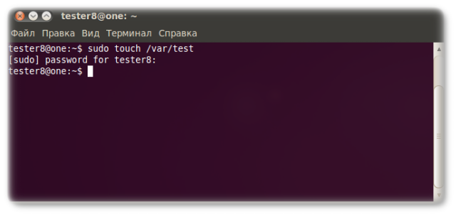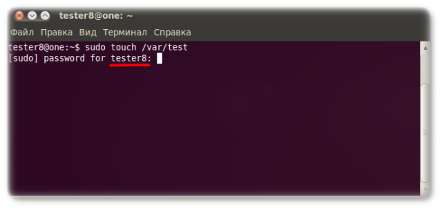 Ключевое выражение здесь "Отказано в доступе". Если вы видите такое сообщение или похожее - это означает что вам нужно запустить команду от имени суперпользователя и вы знаете что вы делаете. Чтобы запустить команду от имени суперпользователя используйте следующий синтаксис. sudo команда Ключевое слово sudo и следующая за ним команда означает запуск этой команды от имени суперпользователя. Давайте попробуем. sudo touch /var/test Вы увидите запрос на ввод пароля.