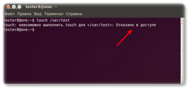 С консолью немного разобрались. Теперь вы можете запускать необходимые команды. Но некоторые команды требуют прав суперпользователя, и о нем мы сейчас и поговорим. Как я уже сказал выше, пользователь имеет полноценный доступ только к своей домашней директории. Но это не означает что вы не можете удалить что-нибудь из директории /bin/ или добавить туда что-нибудь новое. Можно, с помощью суперпользователя. Суперпользователь, это пользователь, который обладает неограниченными правами. Его логин root. Его домашняя директория /root/, такая же как у вас /home/login. Раньше была практика заводить для этого пользователя свой пароль и при необходимости логиниться и делать что нужно. В Ubuntu эта ситуация кардинальным образом изменилась. Кроме доступа к директориям и файлам вы также "ограничены" доступом к запуску определенных программ. Для чего это нужно? Эти программы могут влиять на деятельность системы и вы должны знать, что вы делаете. Чтобы ограничить вас от выполнения какой-либо "опасной" программы случайно, используется это ограничение. Также оно нужно, если на компьютере работает несколько пользователей и есть администратор. Он должен выполнять конфигурацию системы, а пользователи могут выполнять обычную работу. Давайте попробуем создать файл в директории, куда пользователь не имеет доступа. Команда touch создает пустой файл, или обновляет время создания существующего файла. Попробуем создать файл /var/test. touch /var/test