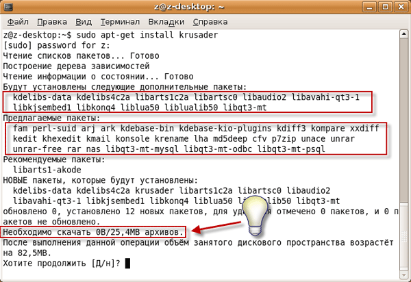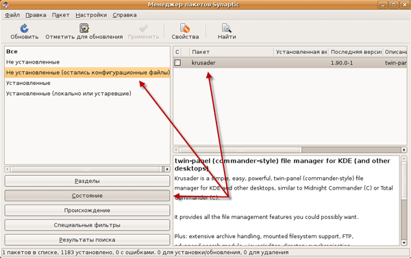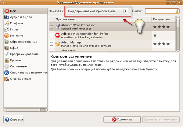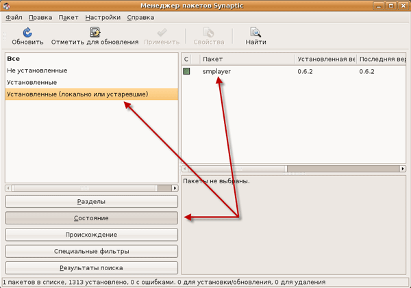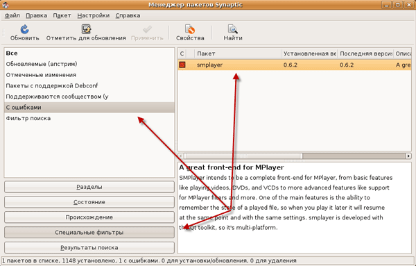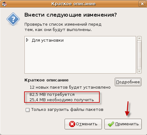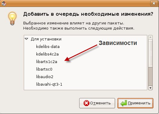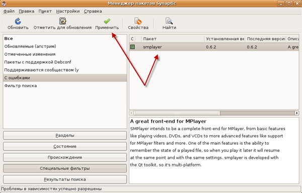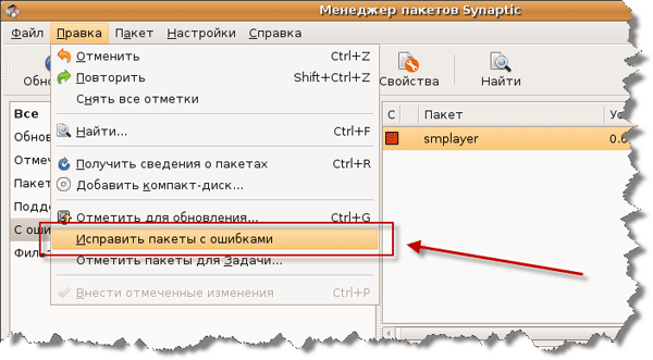 Иногда можно перестараться с установкой ПО и поломать что-нибудь. В этом случае вы увидите предупреждающее сообщение в трее через некоторое время. Либо вы увидите сообщение при запуске Synaptic или если вручную попробуете что-нибудь установить. ![]() Эта ситуация может возникнуть, например, если с помощью dpkg -i попытаться поставить пакет, для которого не были найдены зависимости. Ну и много других ситуаций. Чтобы увидеть проблемный пакет в Synaptic выберите "Специальные фильтры - С ошибками". ![]() Чтобы починить пакет, выберите пункт меню "Правка - Исправить пакеты с ошибками". ![]() После этого нужно применить те действия, которые приготовил Synaptic. Это может быть просто установка дополнительных пакетов или удаление неверного пакета, если зависимости не могут быть найдены. ![]() После того как вы нажмете "Применить" - вы увидите какие действия будут выполнены. В консоли можно сделать тоже самое с помощью команды: sudo apt-get -f install AlienИногда бывают ситуации, когда есть только .rpm пакет (другой вид установщика, из других Linux-систем), но установить программу необходимо. Например в таком формате можно найти установщик vmware tools, если вы пробуете Ubuntu на виртуальной машине. В этом случае можно конвертировать .rpm пакет в .deb пакет, хотя это и не рекомендуется. Поможет в этом программа alien Чтобы установить ее: sudo apt-get install alien Или через Synaptic. После того как он установлен, перейдите в консоли в директорию, где находится .rpm пакет и выполните команду: alien имя_файла.rpm Через некоторое время (это может быть долго) будет создан .deb пакет, который уже можно использовать обычным образом. РезюмеПрограммное обеспечение можно устанавливать из репозиториев или вручную. Программа может зависеть от других программ или библиотек. Это называется зависимостями. Зависимости должны быть установлены до того, как будет установлена сама программа. Чтобы установить программу из репозитория, используйте Synaptic или apt-get. Консольный вариант очень хорош для использования в скриптах или если надо установить сразу много пакетов. Чтобы установить пакет, который вы предварительно скачали, вручную - просто дважды на нем кликните или используйте команду dpkg. Иногда можно поломать пакеты, чтобы исправить это используйте Synaptic или команду sudo apt-get -f install. Пакеты .rpm можно конвертировать в .deb, хотя это и не рекомендуется. Используйте программу alien чтобы сделать это. Иногда не знаешь, что нужно поставить, а просто хочется поэкспериментировать. Для этих целей лучше всего подходит программа, которую можно вызвать через меню: Приложения- Установка/удаление приложений. Все операции по установке-удалению должны быть произведены от имени суперпользователя.