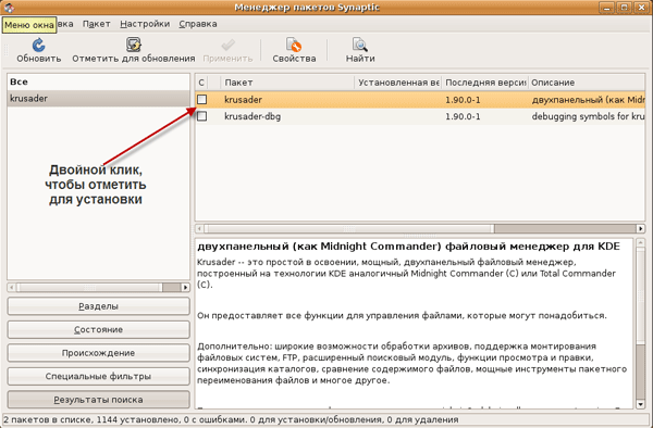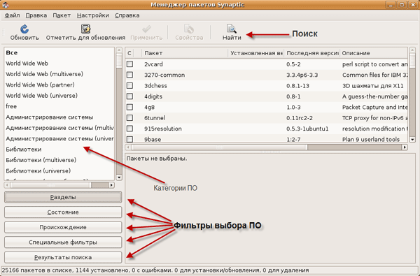 Как я уже говорил ранее, в Ubuntu используется несколько другая система установки ПО, чем в Windows. В этой статье я не буду возвращаться к теме установки репозиториев. Если вы этого не сделали или слышите про это первый раз - прочитайте соответствующую статью. Тем не менее, ПО можно ставить и традиционным способом: скачать пакет (это нечто вроде setup.exе в Windows) и запустить. Также можно скомпилировать ПО вручную из исходников, но это уже выходит за рамки данной статьи. ЗависимостиРазные разработчики разрабатывают разные программы и библиотеки. Определенная программа может зависеть от десятка библиотек, которые разработали разные люди. Следить за всем этим вручную - неблагодарное занятие. Можете попробовать вручную скомпилировать программу, у которой много зависимостей, и вы поймете о чем я говорю. К счастью для нас, проблема эта решена. Каждый раз когда вы ставите какое-либо ПО из репозитория или вручную при помощи пакета-установщика, программа-установщик разбирает эти зависимости и устанавливает их вместе с нужным вам приложением. Но иногда бывает и такая ситуация, когда репозитории не подключены (например если нету интернета) и единственный способ поставить программу - скачать ее предварительно где-нибудь и потом ставить вручную. В этом случае вам придется поставить зависимости вручную. Пример можно посмотреть тут. В приведенном примере плагин для gnome network manager, который позволяет управлять pptp-соединениями (vpn), зависит от базовой библиотеки pptp-linux и ее нужно также скачать и установить до того как вы будете ставить этот плагин. В любом случае при установке вы будете предупреждены, если нужная зависимость не установлена и не может быть найдена в репозиториях, так что теперь вы знаете в чем дело. И напоследок о зависимостях: допустим, вам надо скачать какую-то программу. Она тянет за собой 5 зависимостей. Каждый из них тянет за собой по 5 зависимостей еще. В итоге может получиться так, что сама программа занимает 1 мегабайт, а скачать надо 50. Так что потом не удивляйтесь. .deb = setup.exeВ Windows, чтобы установить программу, необходимо скачать некий файл, наподобие setup.exe, который сам все установит. В Ubuntu используется похожая система, только вместо setup.exe используются файлы с расширением .deb Это пакет-установщик. В разных линукс-системах установщики могут быть разные. Например, в системе RedHat Linux для установки используются пакеты с расширением .rpm Зачем это нужно знать? Когда вы ищите ПО в интернете (если его нету в репозиториях) - обычно на странице загрузки предоставляются различные пакеты. Вам нужен deb! Даже когда вы устанавливаете что-либо из репозитория, невидимо от вас программа скачивает deb файл (или несколько файлов, если имеются зависимости) и потом устанавливает его. SynapticЗаходим в меню Система - Администрирование - Менеджер пакетов Synaptic ![]() Перед нами Synaptic. С помощью него можно установить и удалить любое приложение из подключенных у вас репозиториев. ![]() Слева вверху вы можете видеть кнопку "Обновить". Напомню еще раз о репозиториях: ПО хранится в интернете на специальных серверах. Репозитории регулярно обновляются новыми версиями приложений и дополняются новыми программами, и поэтому, чтобы быть в курсе о том, что находится в репозиториях прямо сейчас - необходимо регулярно обновлять эти сведения. Если у вас стоит автоматическое обновление ПО, вы мож